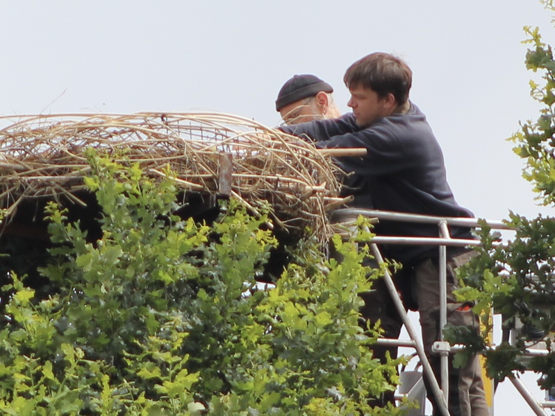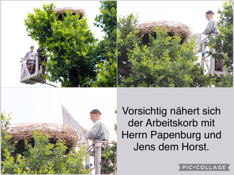 Um 15.30 Uhr ist das "Fertighaus" oben. Die Störche waren in dieser Zeit auf Futtersuche unterwegs und haben von den Arbeiten an „ihrem“ Baum gar nichts mitbekommen.