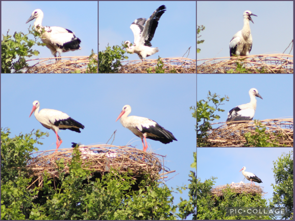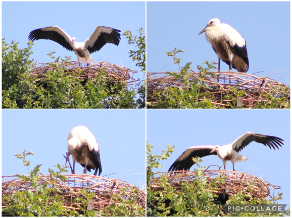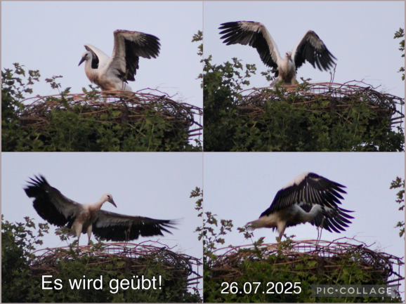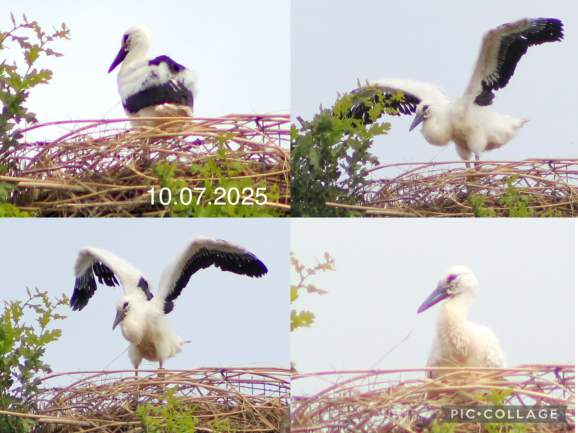 Unser Jungstorch trainiert seine Muskeln und breitet hin und wieder seine Flügel aus und übt. In den nächsten Tagen wird er/sie wohl zum Jungfernflug starten. Wir sind gespannt.