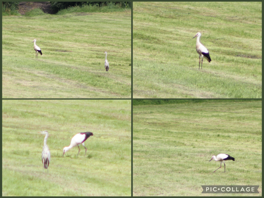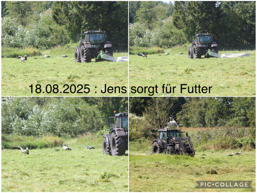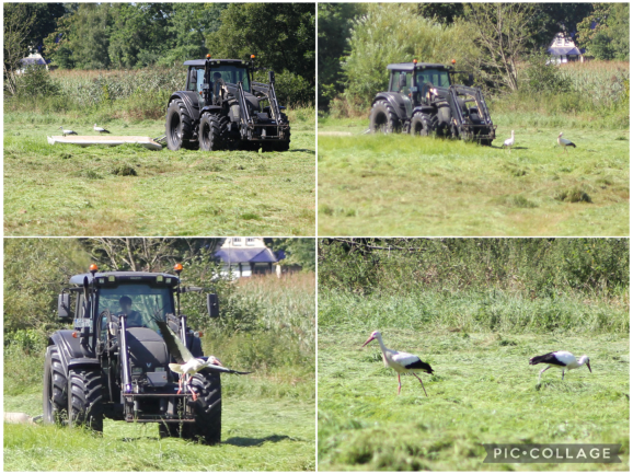 Jens muss teilweise vorsichtig fahren, denn die Störche haben keine Scheu vor großen Maschinen und laufen auch mal direkt vor dem Trecker mit dem Mähwerk herum. Aber alles hat gut geklappt.