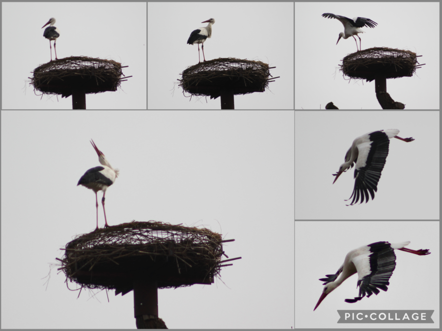Heute ist Dietmar das erste Mal in diesem Jahr wieder auf unserem Dach gelandet. Er klappert, er holt Nistmaterial, er frißt in Hofnähe auf den Örtzewiesen und dann steht er wieder auf seinem Horst.