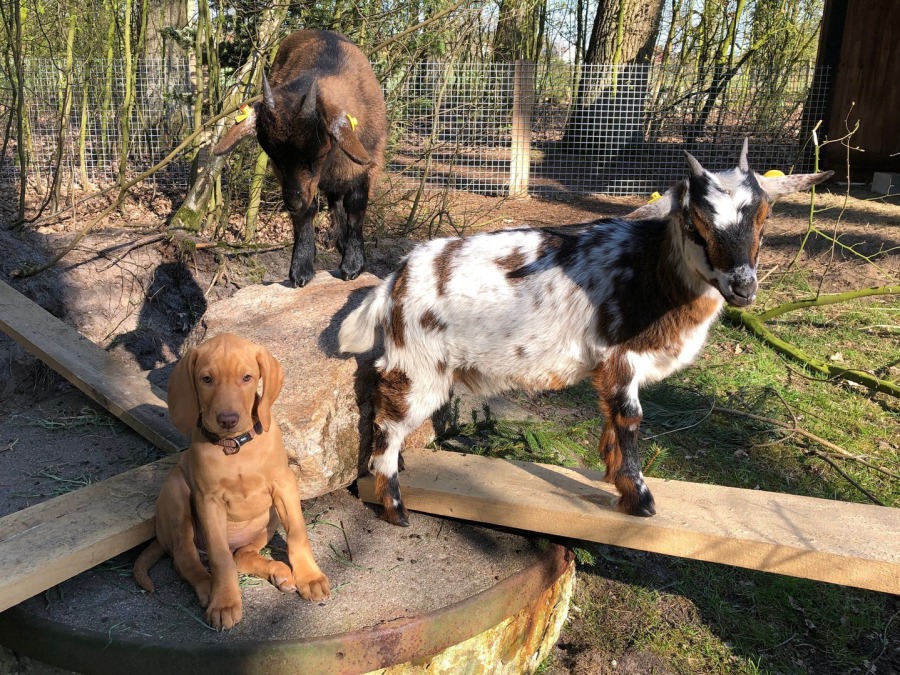 17.04.2019 - Unsere Zicklein hatten heute Besuch von einem Vizsla-Welpen !