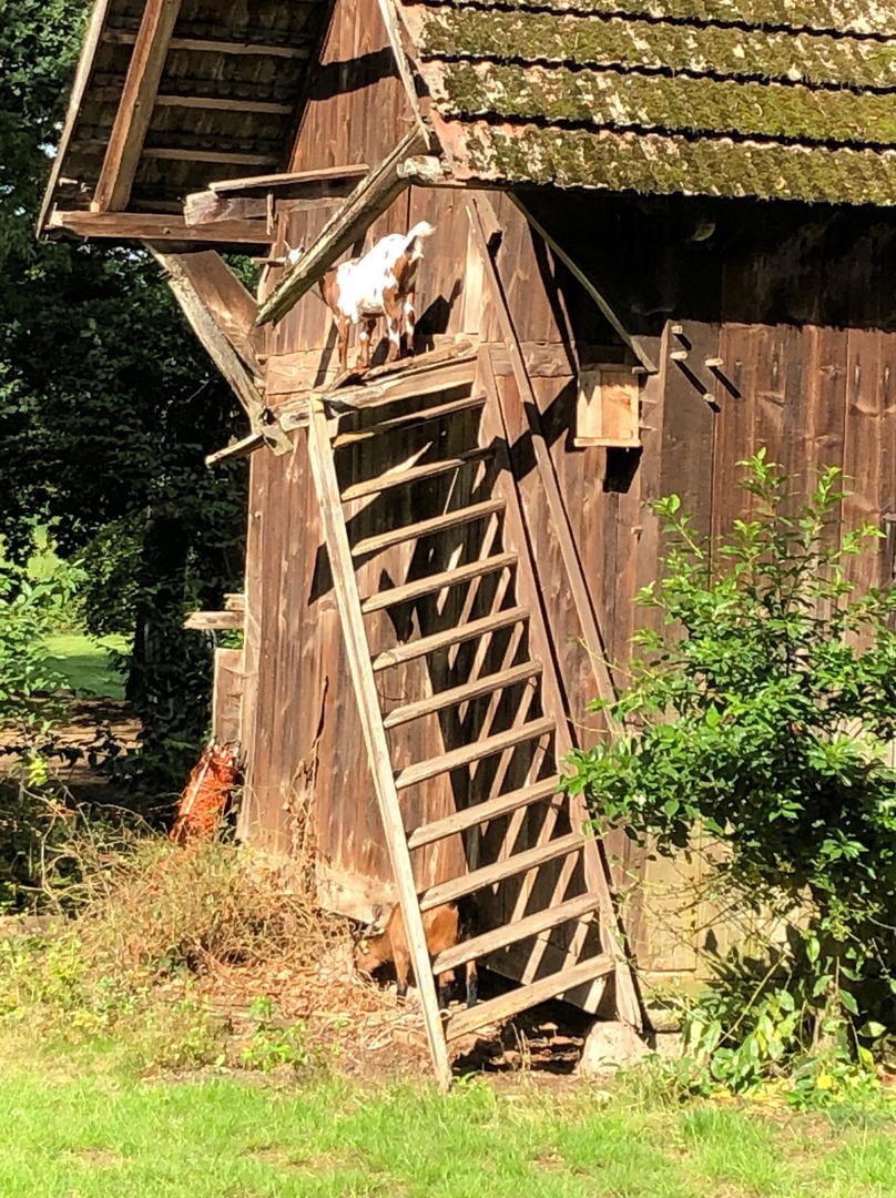 Morgens vergnügen sie sich mit ihrem Kletterpark in ihrem Auslauf. Am späten Vormittag werden alle Ziegen täglich in den Freilauf auf das Hofgrundstück gelassen. Sie besuchen das 31 Jahre alte Pony "Calypso", schauen am Wohnmobilstellplatz nach dem Rechten und sind die ganze Zeit mit Laufen, Fressen und Klettertouren über die Speichertreppen auf die Stallgebäude beschäftigt. Ich möchte gerne mal wissen, wieviel Kilometer die Ziegen am Tag so zurücklegen. Das Beobachten macht viel Freude und wenn ich rufe, kommen alle sofort angelaufen. Weiterer Nachwuchs ist erstmal nicht geplant, zunächst muss Bounty erstmal ausgewachsen sein. Dann vielleicht!