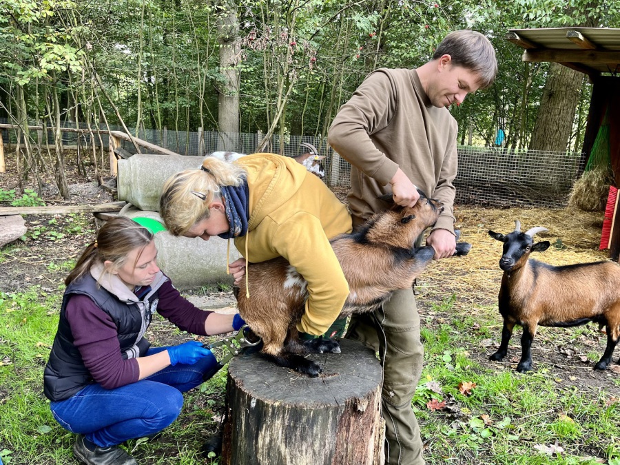 Sie macht eine unblutige Kastration mit der Burdizzo-Zange. Die Böckchen werden zuvor örtlich betäubt und bekommen dann noch ein Schmerzmittel für die "Nachwehen".